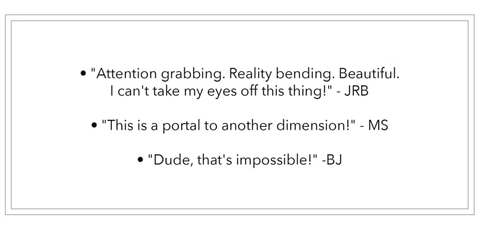 This isn't our first illusion. Our previous, "Slow Dance", raised over $550,000 and now lives in over 9,000 homes around the world — a simple frame that made real objects move in slow motion.
