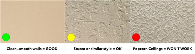 Smooth surfaces like well-painted drywall are ideal. Some light to medium textures (e.g., light stucco) can still hold, but heavily textured surfaces like popcorn ceilings are not suitable — the vinyl will not adhere reliably.